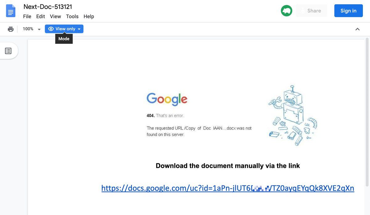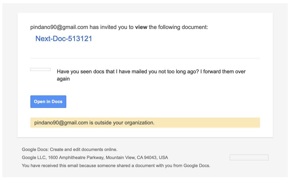 I find it fascinating how Google can build Zanzibar but not flag this. To me it seems like it would be easy scoring 1. Does the gmail account generally mail me (or anyone?) links? No 2. Does the linked doc contain a link? Yes 3. Malicious link (maybe a VT lookup) ? -> Somewhat