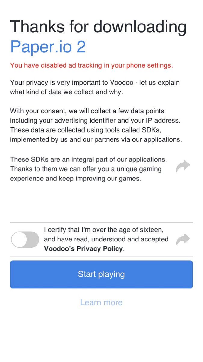 So after all this, you still like the game and can't stand the 30 seconds of forced ads after every game, so you pay a reasonable sum for the ad removal. That removes the ads, but as long as you have *Limit Ad Tracking on in iOS, it will keep bugging you about disabling it. 7/n