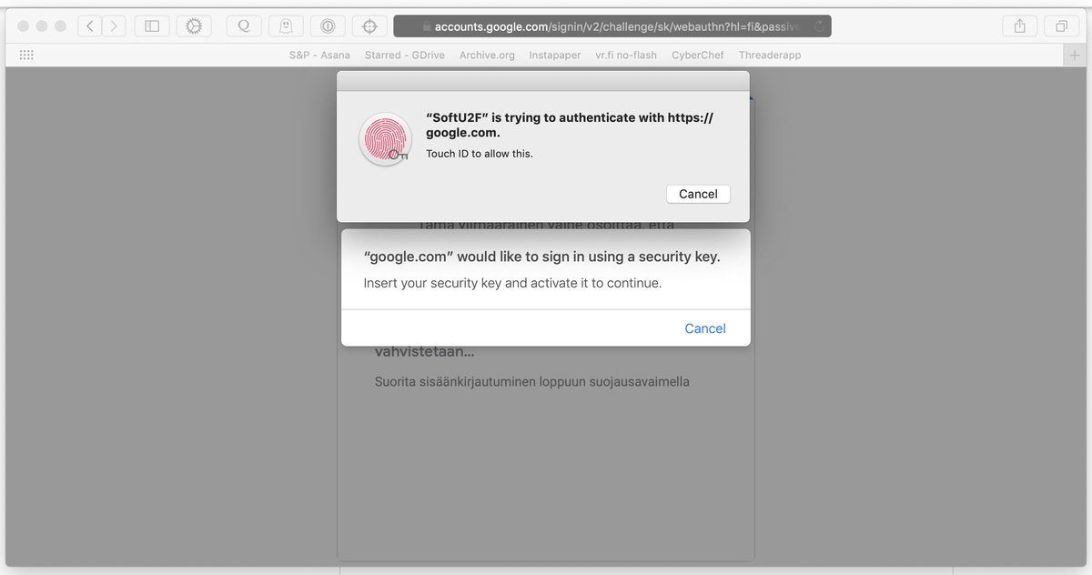 This is very nice! Since Safari 13+ now supports WebAuthN you can use your Secure Enclave as Token with SoftU2F, even for Google.com but you need to add the key using Brave/Firefox (not nice), after that you can authenticate with it in Safari 1/4