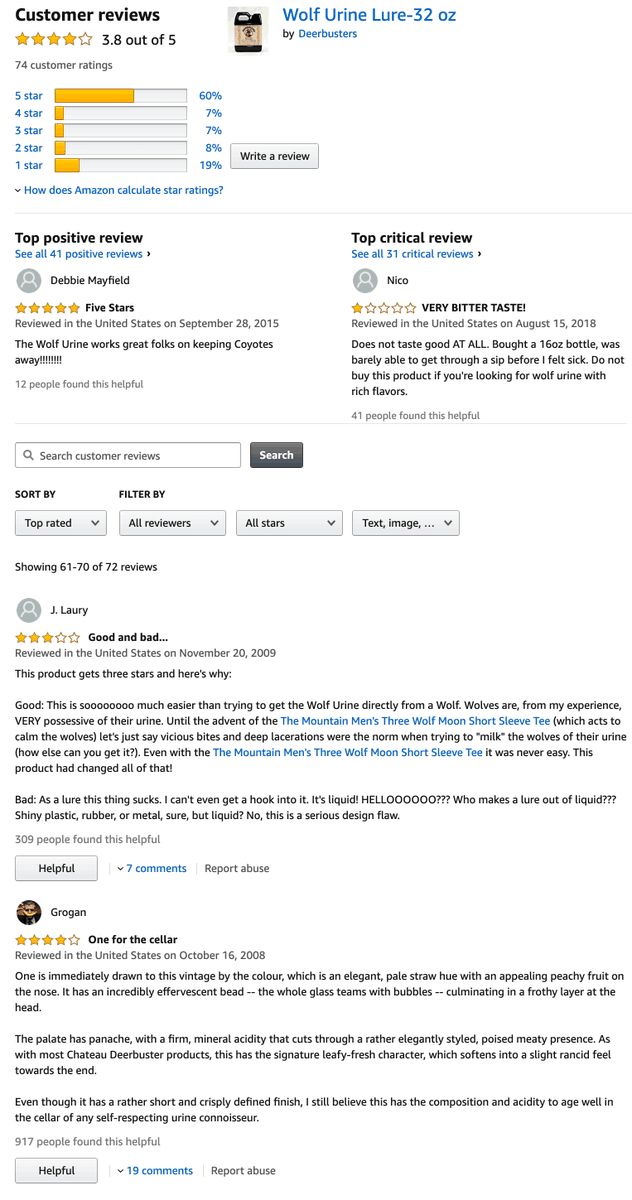 Internet comments bring forth both the best and worst parts of Internet, but with proper moderation and voting system they are truly remarkable sometimes. This one on Amazon is a classic (although the funny ones have had to give way for newer ones it seems, these are at the end)