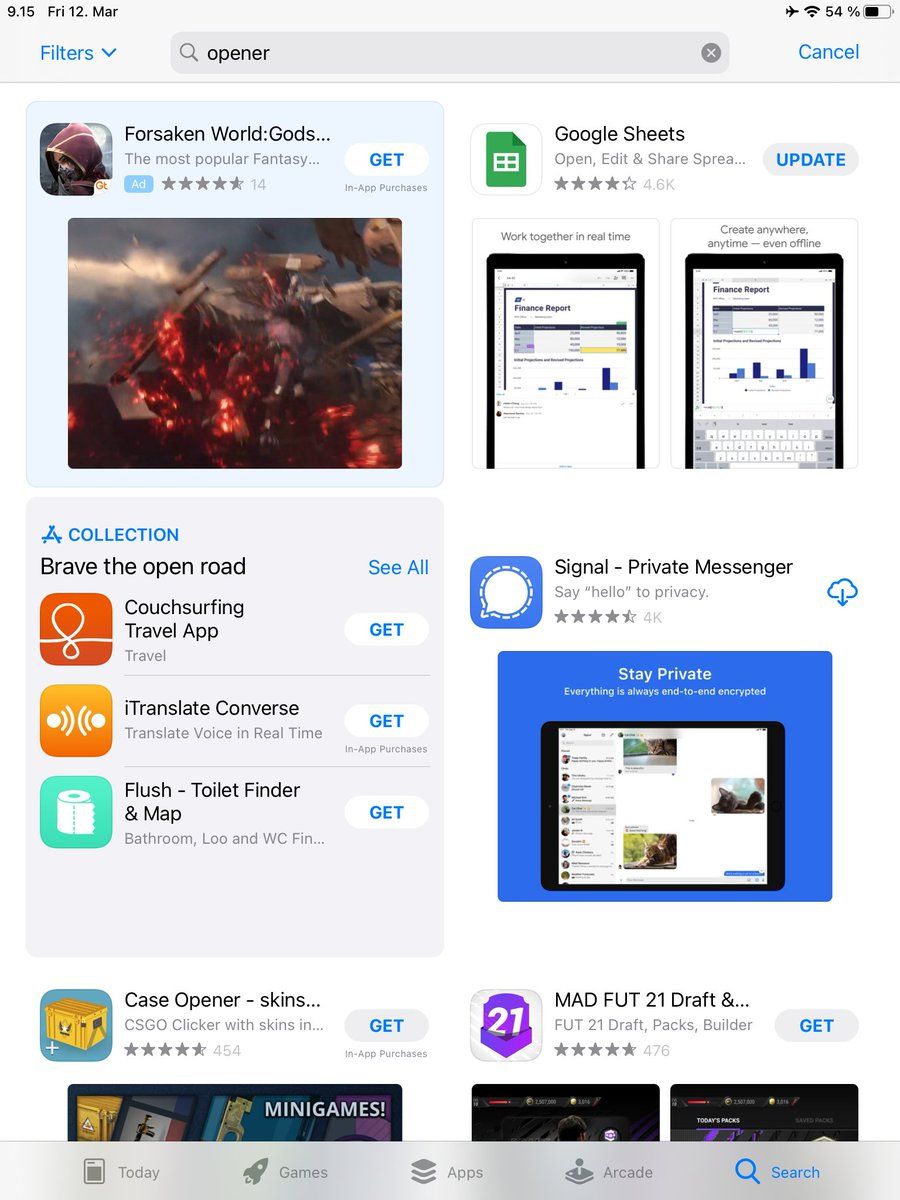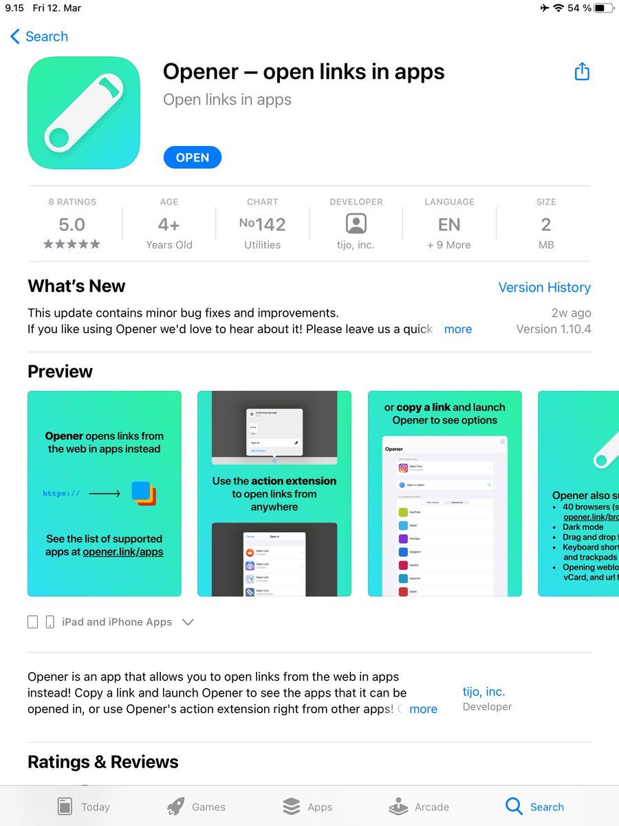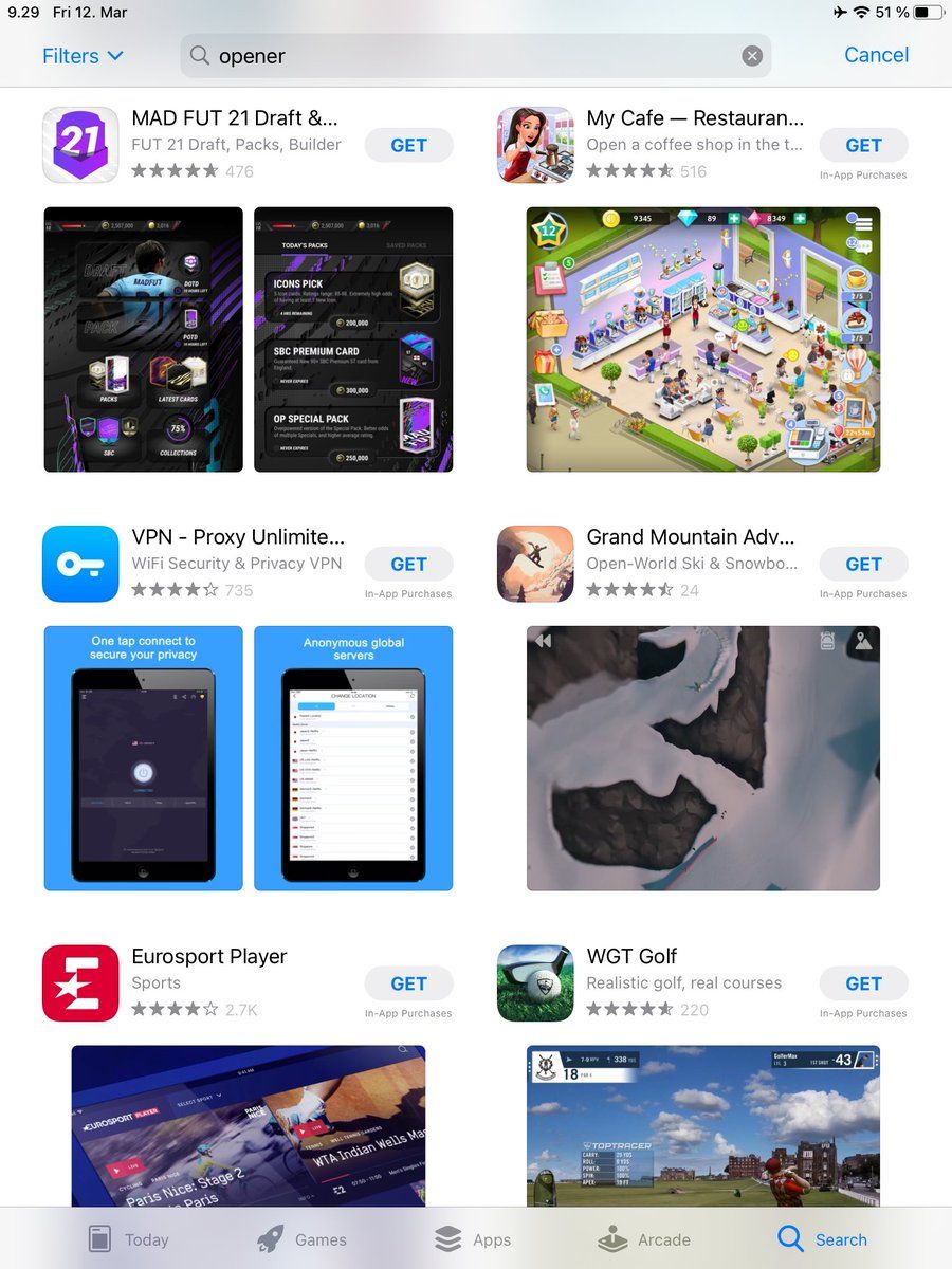 How can the App Store search be so bad? There are so many ridiculously smart people working at Apple.. But still, searching “opener” returns Google Sheet, Signal and a bunch of other apps (keyword spam results? I mean vpn what?) but not the real @OpenerApp
