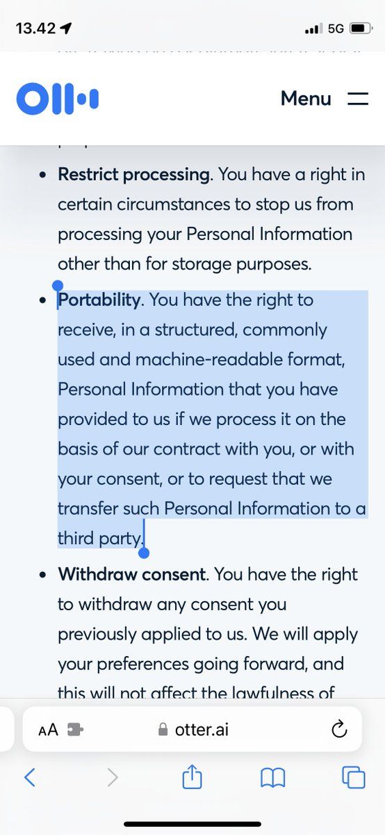 @metaviv @otter_ai Try a GDPR request? Not familiar with Otter but seems the data should fall under it. ico.org.uk/your-data-matters/your-right-to-get-copies-of-your-data/preparing-and-submitting-your-subject-access-request/
