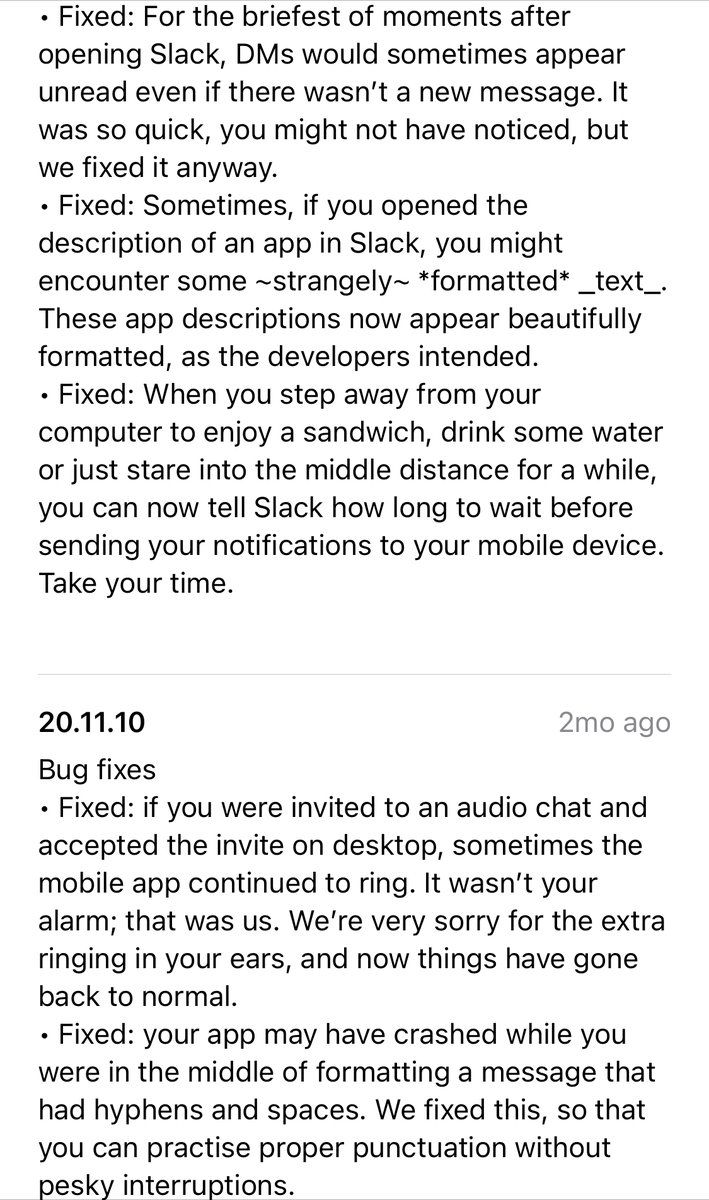 Who writes the version history for @SlackHQ ? It’s a joy to read. I feel a bit bad that they write better version update notes than I write blog posts but I read them and try to learn from them. Maybe @ryanhuber still knows? so I can give my compliments.