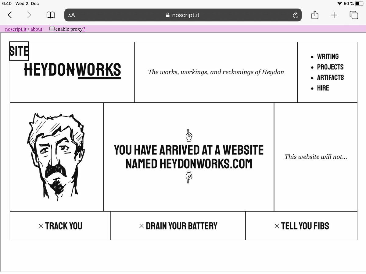 @heydonworks Nice performance Works well to demo a side project/PoC of mine which leverages the ability to disable JS inside a iframe noscript.it/#https://heydonworks.com/