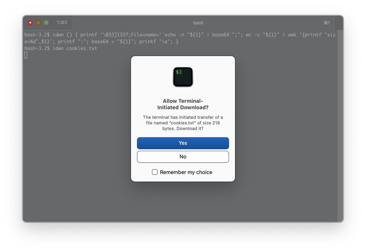 Came across this little gem today gitlab.com/gnachman/iterm2/-/wikis/Base64FileDownload #iterm @gnachman But I didn't want to create a shell script so idwn () { printf '\033]1337;File=name='