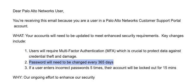 How are we going to ever convince people that forced password rotation is a bad thing when @PaloAltoNtwks introduces it as a new security measure in 2022? @thorsheim
