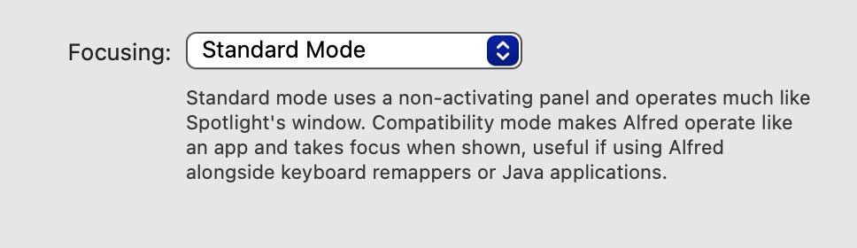 PSA If you use iTerm and @alfredapp clipboard history and don't want the hotkey window to disappear when you open the clipboard history window, then make sure you have Focusing set to Standard Mode in Alfred. Took me forever to figure out after a clean install...